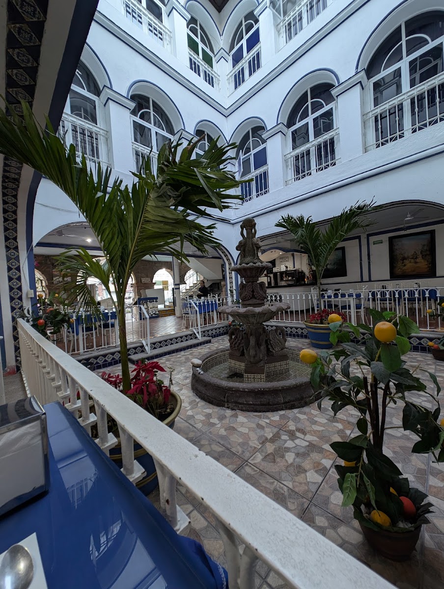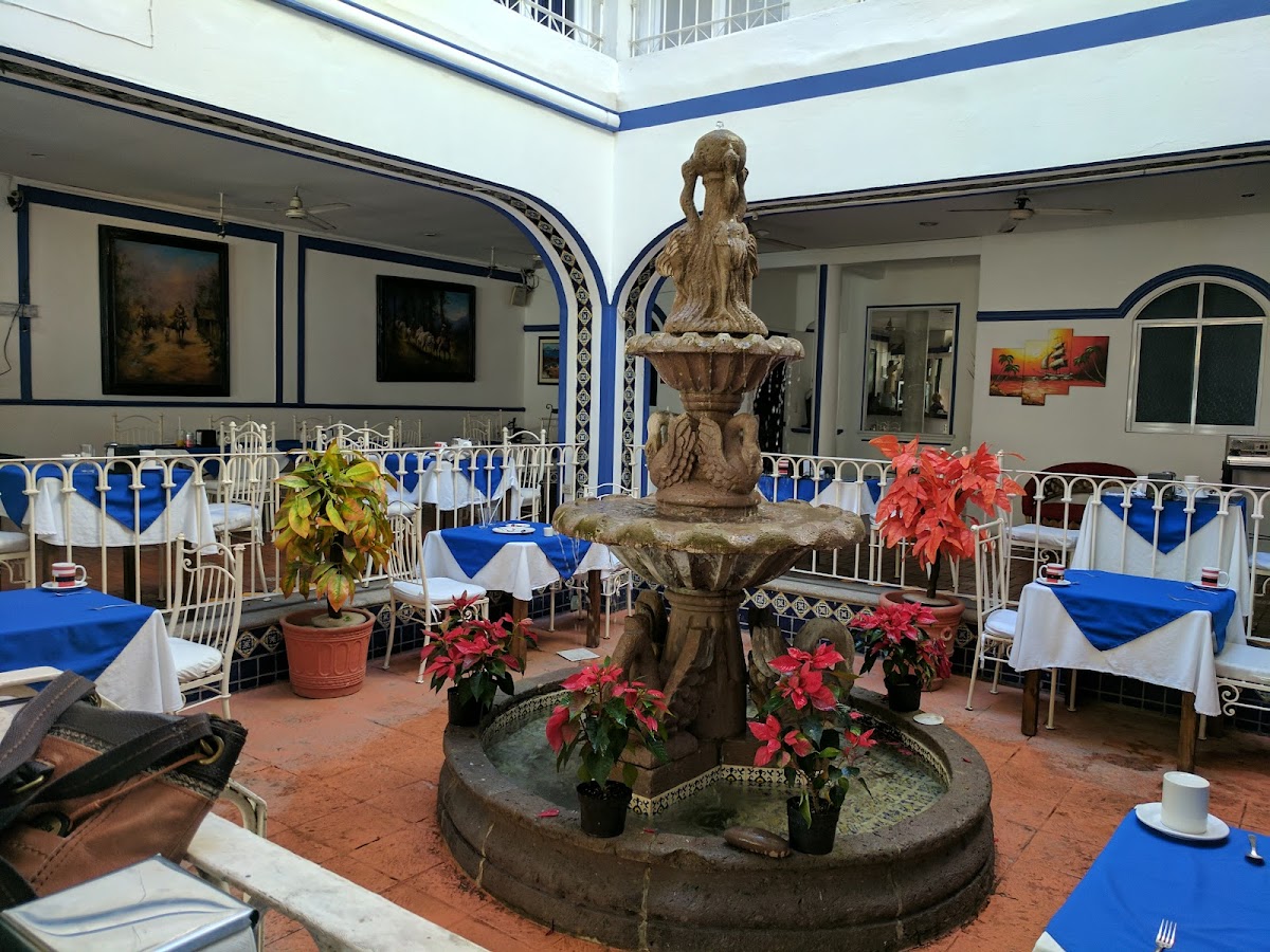 I have walked by this place many times but this morning I decided to stop in and try out their breakfast. The decor inside is old traditional mission style very nicely done, in accordance with the name of the place. There are also many traditional style very interesting paintings on the walls. However, the background music is a Mexican electronic hip-hop with a drum backbeat that besides being very annoying is not in keeping with the style of the restaurant or hotel. The inside is large and clean with a sunlit central area with a nice fountain and waterfall that adds a nice ambience. I did not stay in the hotel so I can't speak to that aspect. The waiter did not speak much English but was friendly and very attentive. I got the breakfast special for 69 pesos plus an orange juice and toast instead of tortillas. The plate was nicely presented but the eggs were unspectacular, certainly ok for the price. The American coffee was good and came in a large mug. They also had Wi-Fi which allowed me to catch up on some reading and also to write this review. Overall, this is just the place I was looking for. A local Mexican experience away from the tourist trappings and prices. Post note: the waiter also informed me that bringing our little dog here for dinner would not be a problem since it is not very crowded (I am writing this in the beginning of May so it's a little offseason).